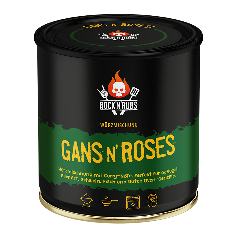 Rock’n’Rubs Gans ‘N Roses, een kruidenmix met een vleugje kerrie en rozenblaadjes.